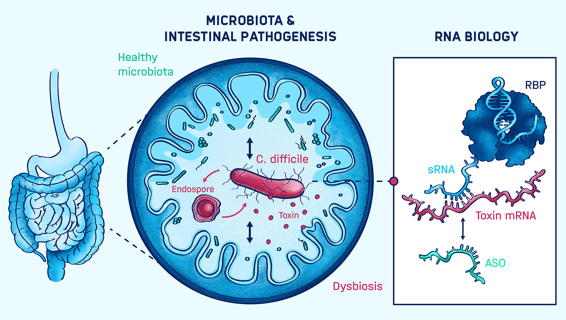 Enteric infections and their clinical outcome are often associated with underlying microbial dysbiosis, an imbalance in the microbiota. Clostridioides difficile—a leading cause of antibiotic-associated diarrhea—is a prime example: In healthy individuals, infection with C. difficile results in asymptomatic colonization. However, after antibiotic treatment, the enteric pathogen causes a wide spectrum of diseases. Therefore, a mechanistic understanding of virulence regulation in the context of pathogen-commensal interactions is paramount for the development of novel RNA-based therapeutics.